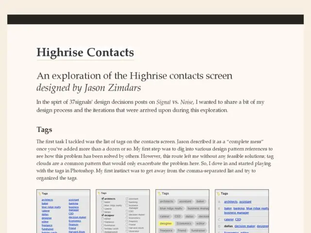 Jason Zimdars describes the explorations and iterations over 37 Signals' Highrise CRM application. There's some nice description of the decision making process to arrive at modifications to the UI that clean up the use of tags clouds, organize listings of contacts, and attention to details around type and proportion.