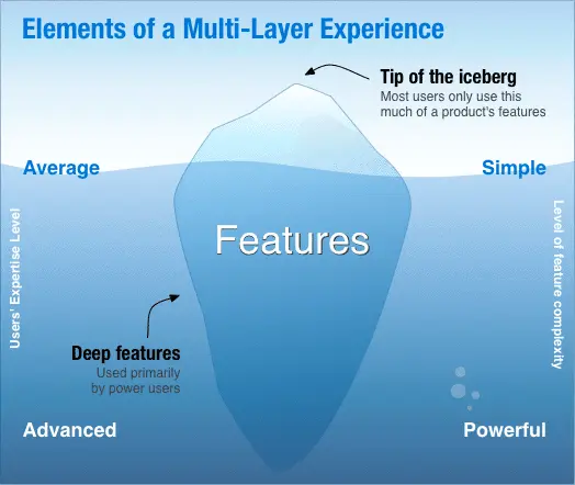 I love the idea behind this. It becomes our responsibility as interface designers to know how to identify the tip of the iceberg to provide the simple defaults, but simplicity isn't all. We might keep the majority of our users working with the obvious features, but we want to provide the conditions that will let them become expert, and over time keep them feeling continually challenged and satisfied. Our challenge comes in knowing how to push the iceberg up, or teach the user how to swim deeper below the surface.