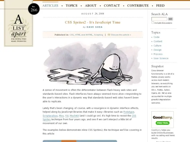 - Dave Shea's tutorial in ALA shows how to create interactive menu hover effects using CSS sprites and the JQuery Javascript library. A sprite image is a single graphic with multiple states mapped on the graphic, a technique borrowed from game design, where game characters are shown in different states of action. Shea's tutorial extends the use of Bauman's sliding doors sprite method for navigation buttons by adding transitional effects on the graphics.