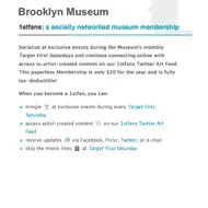 The Brooklyn Museum continues its exploration and extension of Museum services by offering 1stfans a socially-networked museum membership. Members pay a smaller $20 membership fee and get access to special events where they can mingle with other 1stfans members, may skip lines at film events, and get alerts via flickr, facebook, and twitter.