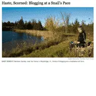 The New York Times fashion section article, "Blogging at a Snail's Pace" discusses slow blogging, a near Ludd-like movement against the practice of posting quick and in high volume. It's like slow food versus fast food. Slow bloggers discard the belief that webloggers need to post often, because the reflectiveness of thought and quality of writing suffer. When comparing the slow versus fast differences, Barbara Ganley, a blogger who writes from Vermont had this to say.