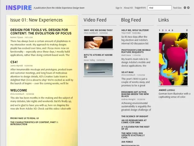 Inspire is a new site from Adobe Experience Design. With interviews, videos, and examples of work, the site is part magazine, part showcase, part news portal. It's definitely worth a regular watch.