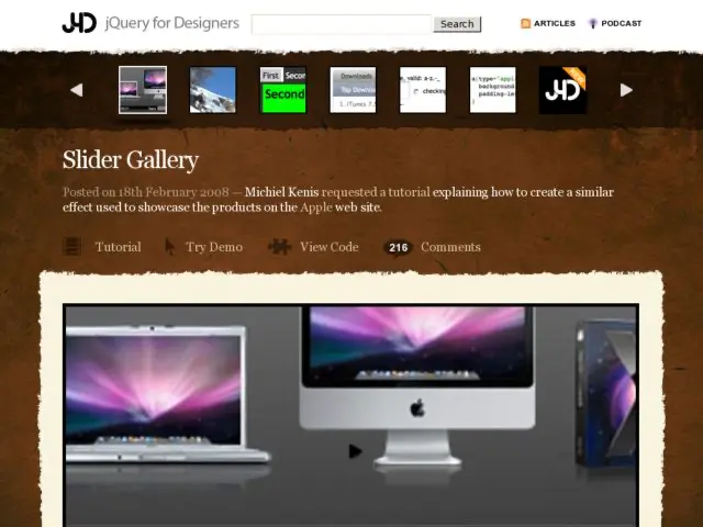 The jQuery Slider Gallery article on jQuery for Designers provides a tutorial and demonstration for using jQuery plugins to create a scrolling gallery similar to the scrolling showcase on Apple's product pages.
