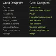 This is a great slide from an presentation given by Cameron Moll in 2006 titled, "Nine skills that separate good and great designers."