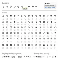 The Konigi OmniGraffle Wireframe Icon Set is a set of grayscale cursors and icons that come in handy when designing wireframes, aka user interface schematics. This product includes a standard set of cursors, and many of the icons you need for the design of web-based user interfaces.