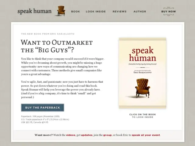 smashLab's Eric Karjaluoto writes about outmarketing the big guys by getting personal in his book Speak Human. He's adding a sneak preview of a new chapter every few weeks, so you can read it online for free. Read the sample chapters on the book site and find the links to buy via Amazon.