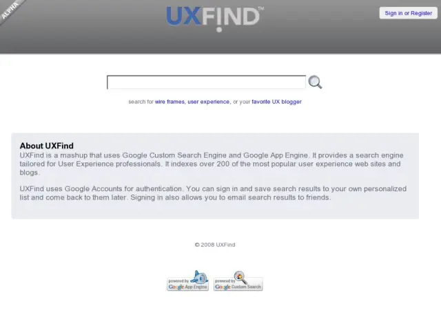 UXFind is a mashup that uses Google Custom Search Engine and Google App Engine. It provides a search engine tailored for User Experience pros. It indexes over 200 of user experience web sites and blogs. Oddly, they index my old blog iaslash, but not Konigi, so I guess the sources might not be so fresh. It's a great idea, and I've tried to do this in the past too, to just limit to sources I trust. To be honest, I always end up casting a larger net, however.