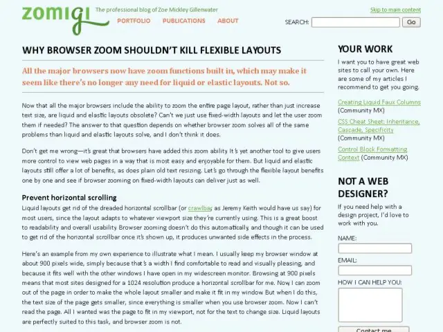 Zoe Mickley Gillenwater posted an interesting article which makes the argument that browser zoom doesn't obviate the utility of flexible (liquid and elastic) layouts. The argument is apparently being made that because of browser zoom, flexible layouts aren't necessary. But in fact, web designers that have fixed layouts know that the default zoom behavior on fixed layouts causes horizontal scrollbars. The fix is to use "Zoom text only" options, e.g. in Firefox and Safari 4.