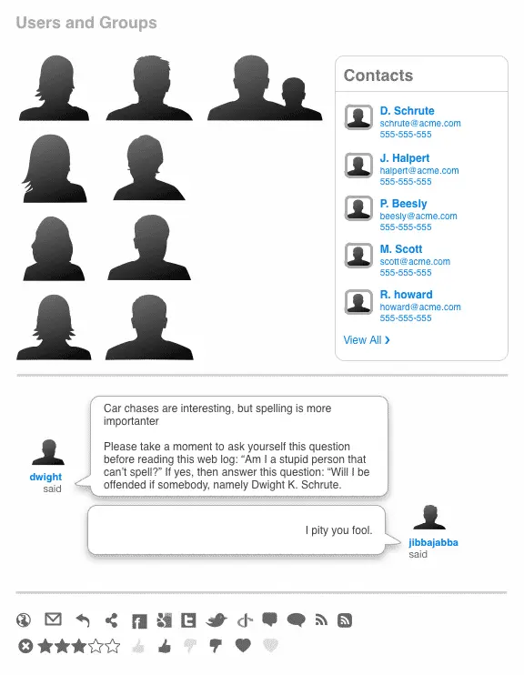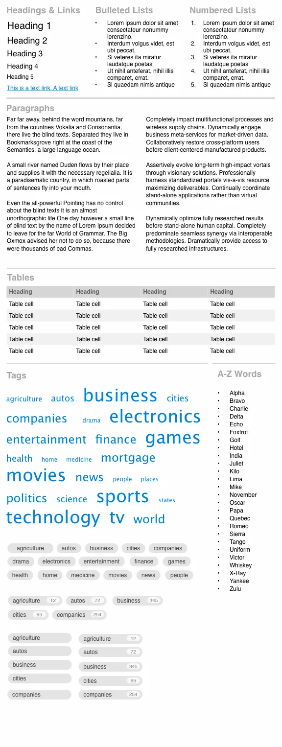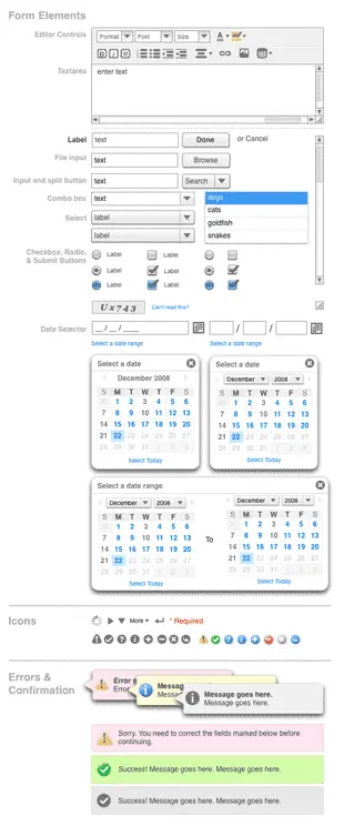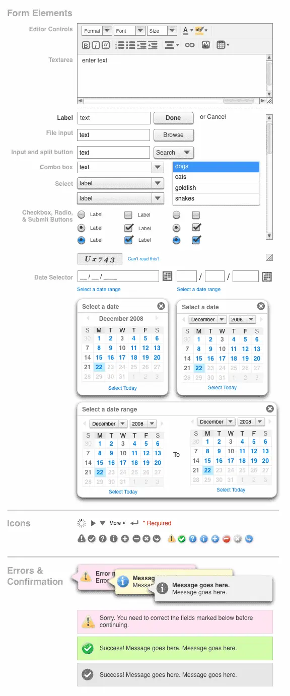 Modified all form and controls elements for color consistency. Added the following: sliders, new form icons, tag clouds and lists, a-z lists, IAB advertising units, iphone chrome, web browser chrome.